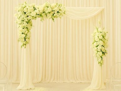 Simple yet sophisticated 8'x10' ceremony arch with faux florals and sheer draping for a beautiful memorable moment.
