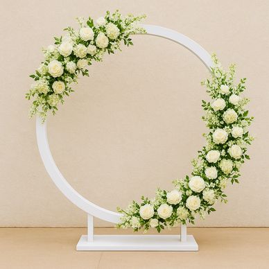 7ft Simply elegant circular wedding background with flowers and sheer drapery. This stunning backdrop is filled with garden roses, roses, daisies, mums and leather leaf.